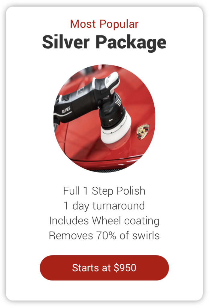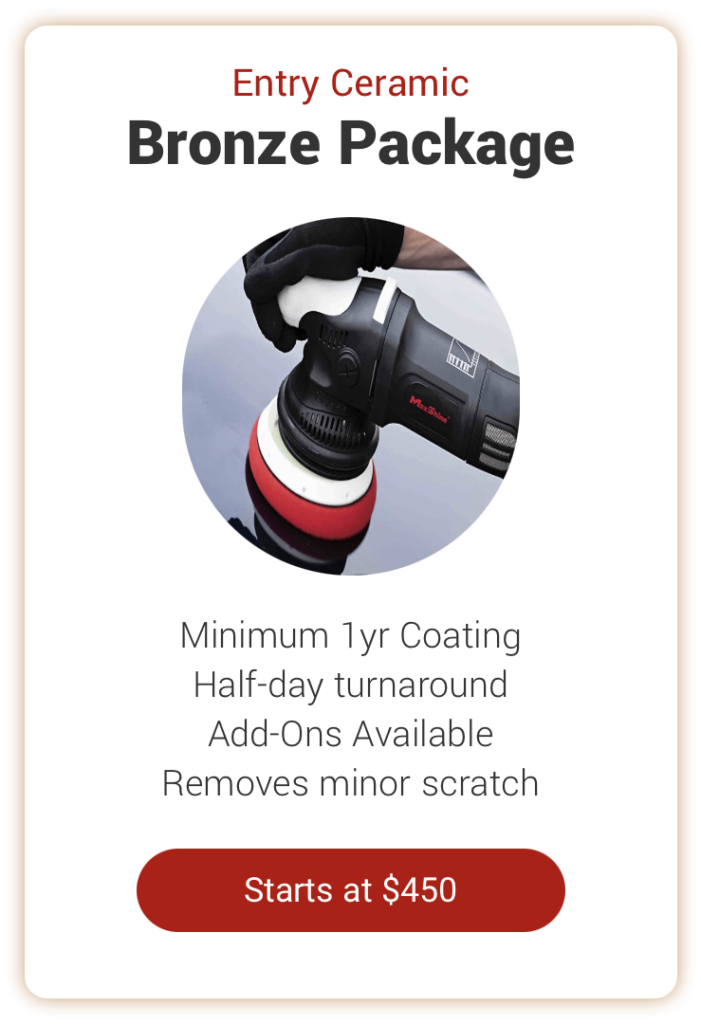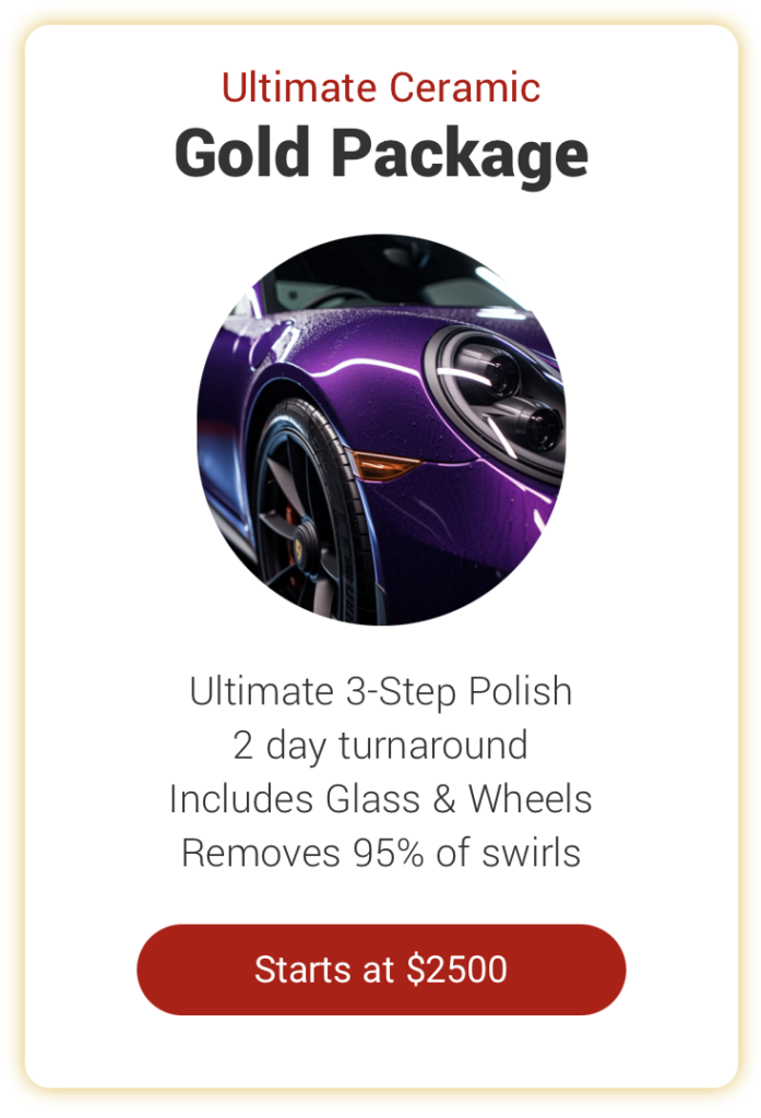 We use the finest pro-grade EVO professional ceramic coatings by Gyeon® Ceramics. This tough nano ceramic coating will add incredible levels of depth to the paint along with unbelievable water and dirt repellency and a rugged durability measured in years. It’s the best ceramic coating we have found and has been known to outperform its competitors such as Ceramic Pro. Gyeon ceramic coating is applied to the vehicle’s paint, plastic trim, glass windows, wheel rims and can even be applied to the interior fabric and carpet as a stain guard. Our ceramic coating comes with a limited lifetime warranty. The price of the coating will vary depending on the condition of the vehicle’s paint, color of vehicle, and the size of vehicle. You can spend anywhere from $500-$3,500 depending on the scope of the project.